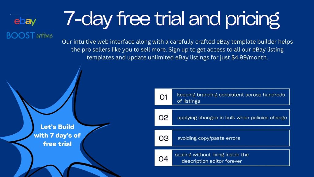BoostOntime’s eBay Template Builder (ETB) is built specifically for sellers who want to grow. It combines the professionalism of custom templates with the ease of pre-built designs-giving you responsive, conversion-focused listings in minutes instead of hours.